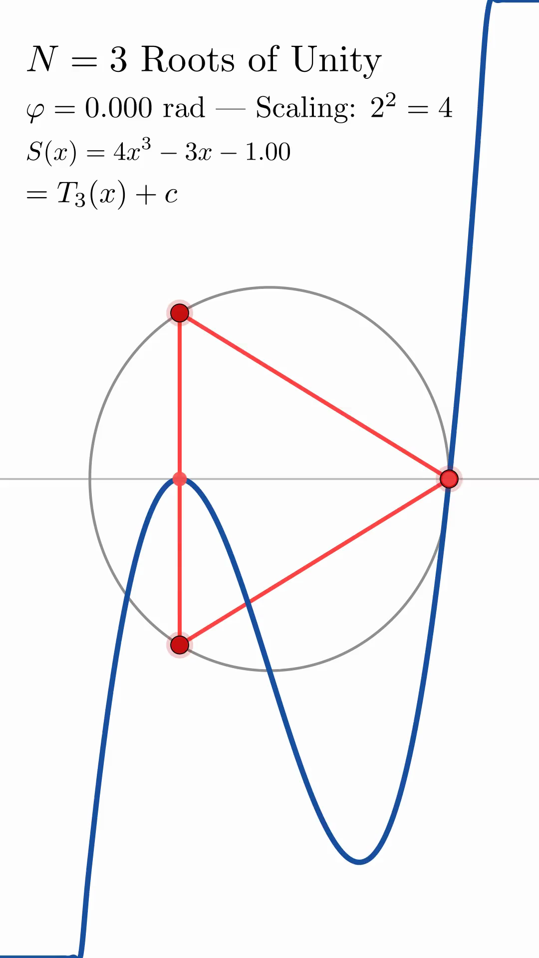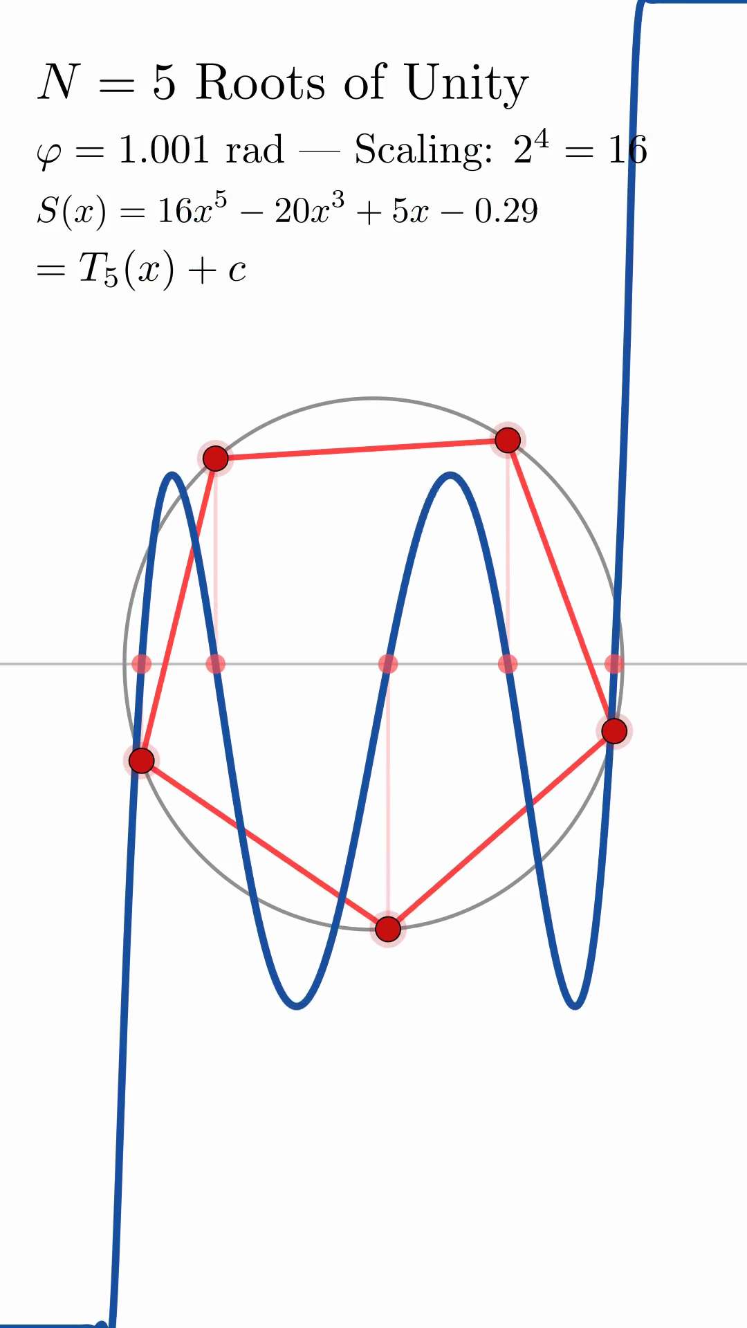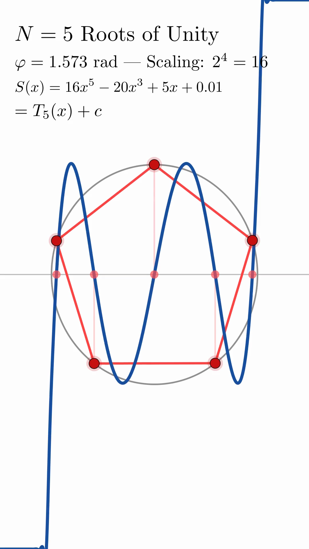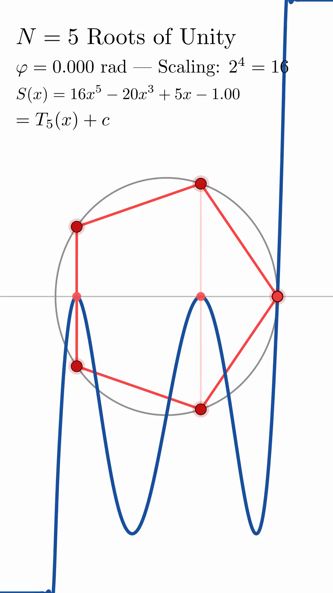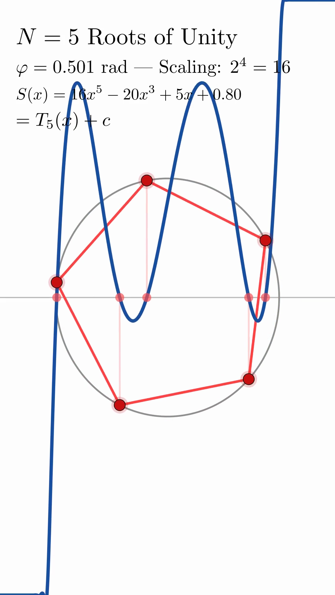 illustrates the geometric construction for \(N=5\) at rotation angle \(\theta = 0\) radians. As \(\theta\) varies, the roots of unity rotate around the unit circle, their projections sweep across the real axis, and the polynomial curve maintains its characteristic Chebyshev shape while only the vertical offset changes. This invariance is demonstrated explicitly in fig:N5_rotation_sequence, which shows the construction at four different rotation angles: \(\theta = 0, 0.5, 1.0, \pi/2\) radians. In each panel, the polynomial curve retains the same fifth-degree Chebyshev shape, with only the constant term varying.